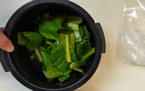 加熱後、すぐに水に取ります。(レンチンし終えたほうれん草は熱いので注意)
